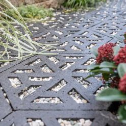 Eco-tegel 37,5×37,5×7 cm antraciet is een betonnen zeskantige steen met grote perforaties waardoor gras e.d. door het materiaal kan groeien. Daarnaast kunnen de tegels worden gevuld met split, schelpen of zand.
