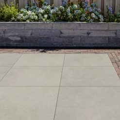 Keramische Tegel 60x60x3 cm Cerasolid Cortona Taupe in onze showtuin in Ermelo